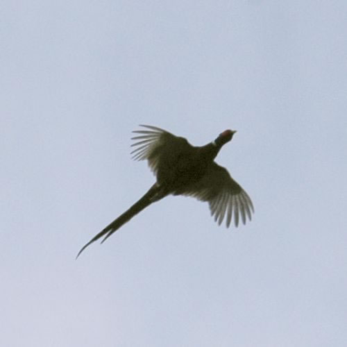 A cock pheasant silhouetted against the sky, a living target. A sight I did not see until ten years after the shooting started. It is flying over my home, a few seconds before being shot.